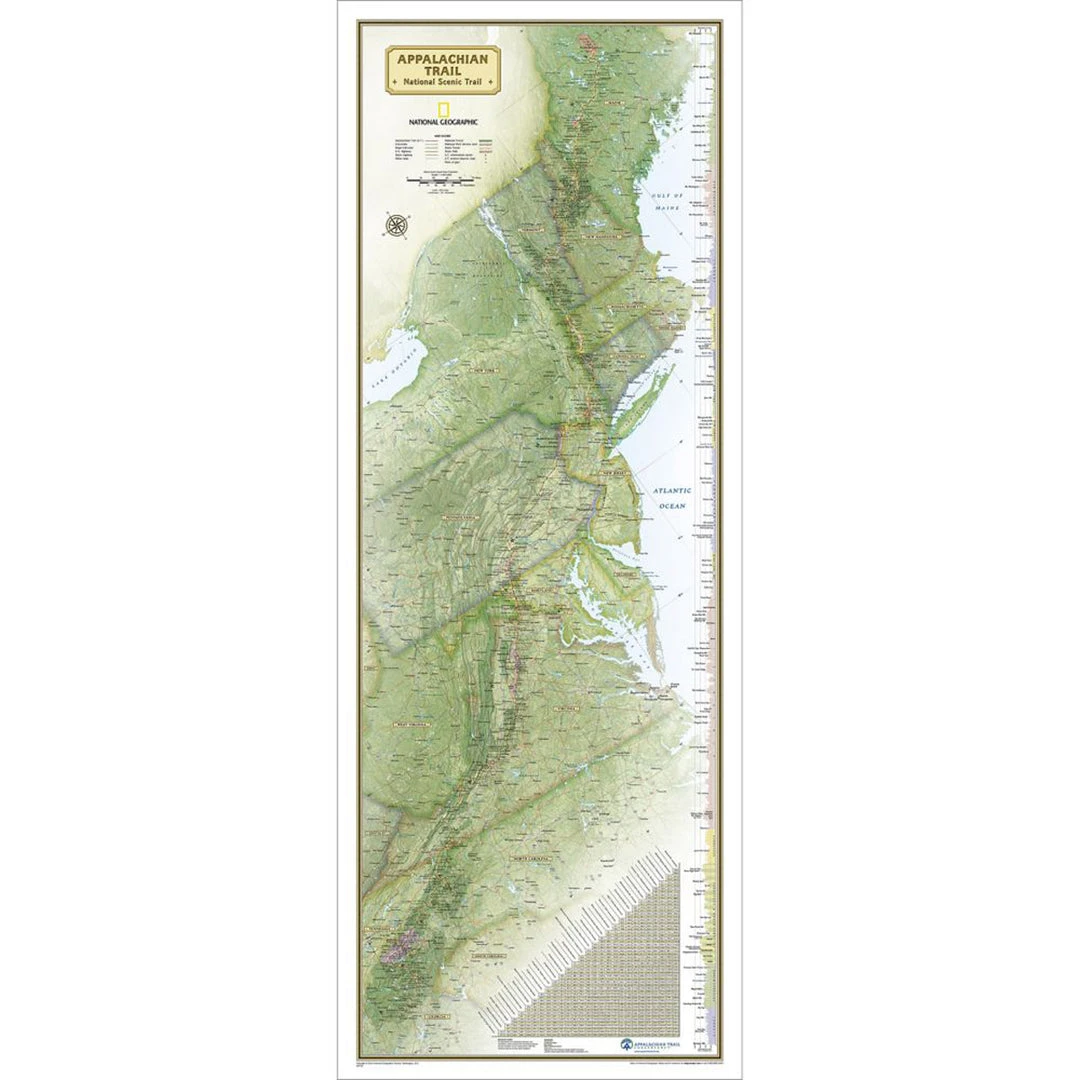 National Geographic’s map of the Appalachian Trail is ideal for fans and hikers of this magnificent national scenic trail. It makes a great planning tool or as reference to track progress on the 2,200 mile length. Developed in cooperation with the Appalachian Trail Conservancy, this beautiful poster, shows the entire length of the trail from Maine to Georgia. A unique elevation profiles highlight the trail’s peaks and valleys and an informative mileage chart shows the distance between key locations. Also highlighted on the map are National Forests, National Park Service lands, State Forests and Parks, and major highways and interstates. Points of interest include Appalachian Trail information centers and shelters.